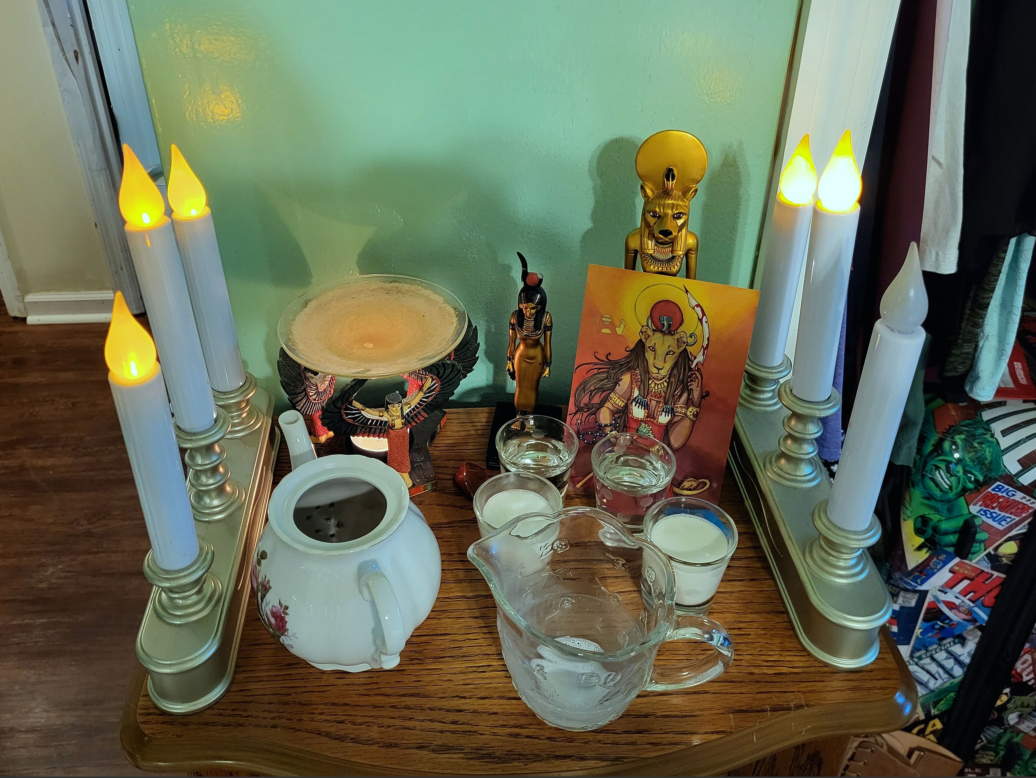 This does mean that there is less milk to share with my cat, Missy, after the rite, a problem I haven’t quite solved yet (because the volume of two shot glasses does not equal that of a custard cup, apparently). After a couple of times where I drank a sip of Sekhmet’s milk and poured the rest back into the creamer for Missy, last time I drank all of Sekhmet’s share (all after reverting, of course) and got Missy her own supply from the fridge, served in one of the bowls I normally use for just one god, but she wasn’t too impressed. I guess it’s got to come straight from the shrine or she’s not interested. I didn’t want to short my experience with Sekhmet this time, but maybe, if I’m going to do just a sip, I should sip from both glasses and then pour the rest for my cat, so that both goddesses receive equal treatment, my cat gets what she’s used to, and (hopefully) everybody’s happy.
