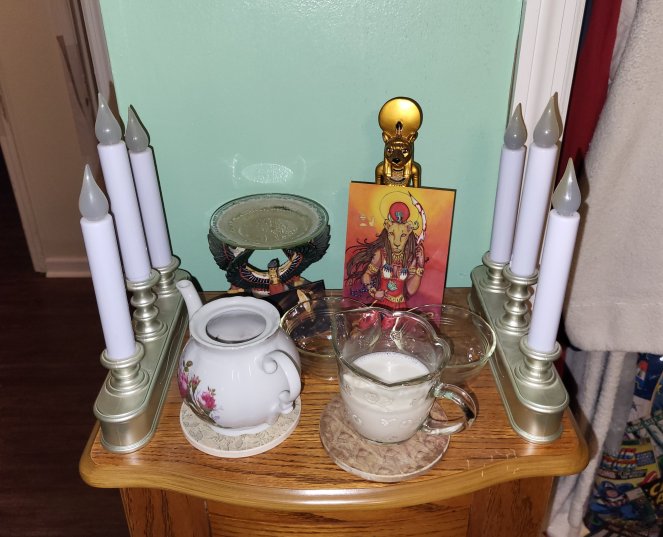 That’s interesting. But either way, I had to celebrate. I ended up doing rite to Sekhmet on the 20th (a day early), and to Aset, Hathor and Nephthys in celebration of my conversion anniversary on the 23rd (a day late). But They seemed to roll with it. Actually, Sekhmet and I came to an agreement to celebrate on the 20th; I forget exactly what my reasons were, and I certainly can’t speak for Sekhmet, but either way, it worked. As for why I was late celebrating my conversion anniversary, I’m not sure but it may have been because the poetry meeting I attend two Mondays a month wiped me out, as it sometimes does. I don’t have the option of not going because I run the Zoom part of our meetings. And we can’t attend in person anymore, at least not fully, because one of our members lives in San Diego now (instead of Tallahassee, Florida, where the rest of us live). At any rate, the goddesses I call my saviors were also okay with having our celebrations on a different day.